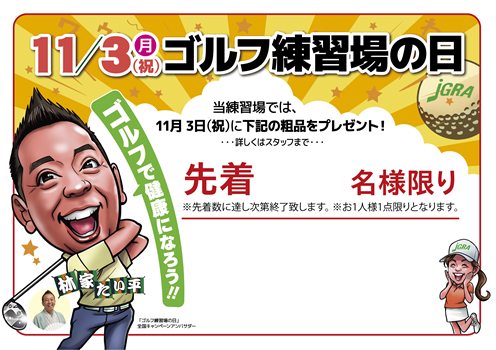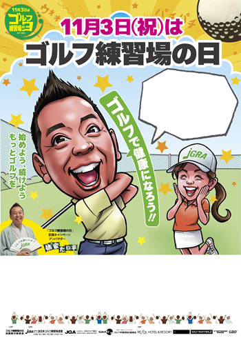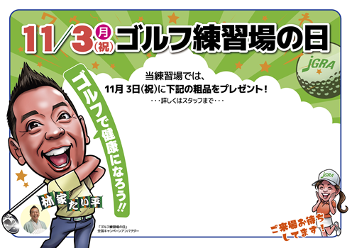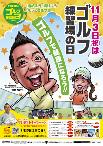 1.林家たい平師匠のイラスト使用については、2025年「ゴルフ練習場の日」キャンペーンイベントに関与する、店内掲示用ポスター、POP(ポップ)、WEB告知のみの使用となっております。このイラストを他の販促物やキャンペーン等にご利用いただくことは出来ませんので、ご了承の程、お願い致します。